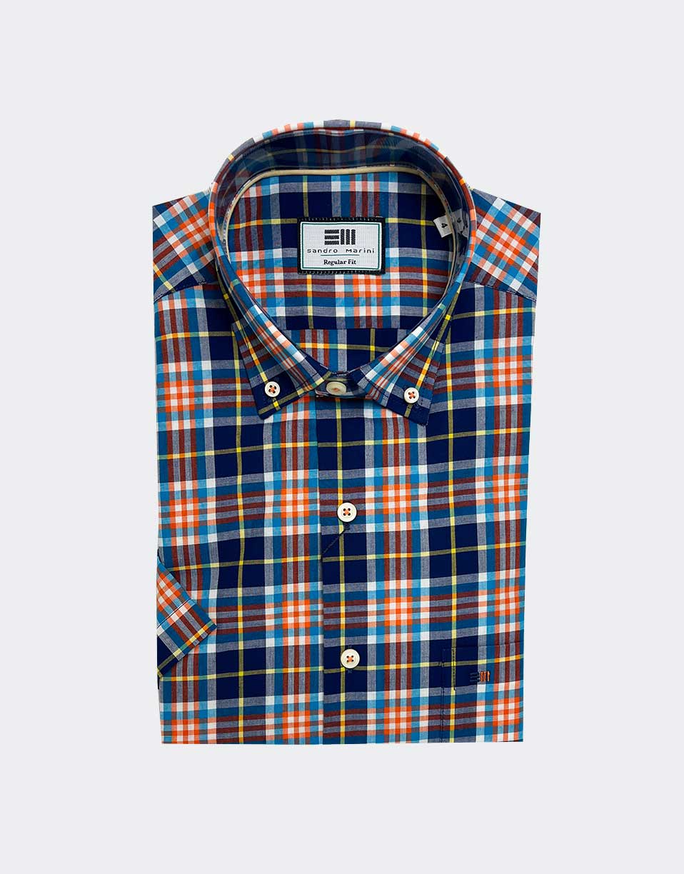 esta camisa de manga corta a cuadros en tonos azules, amarillo y naranja es la elección perfecta.