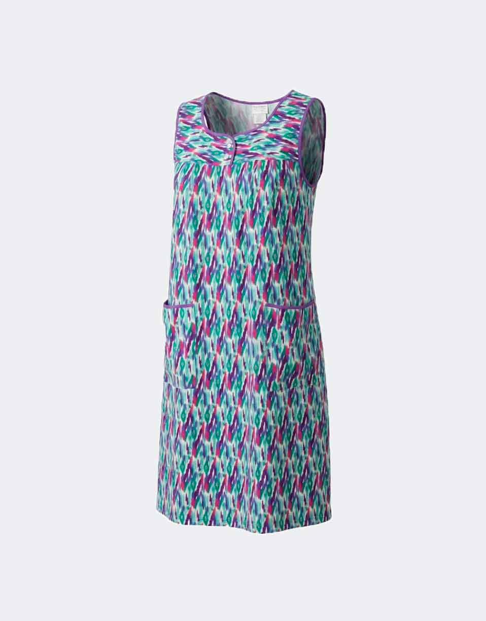 Vestido bata mujer tela SIN MANGAS detalle botones en canesú estampado abstracto lila, rosa y verde