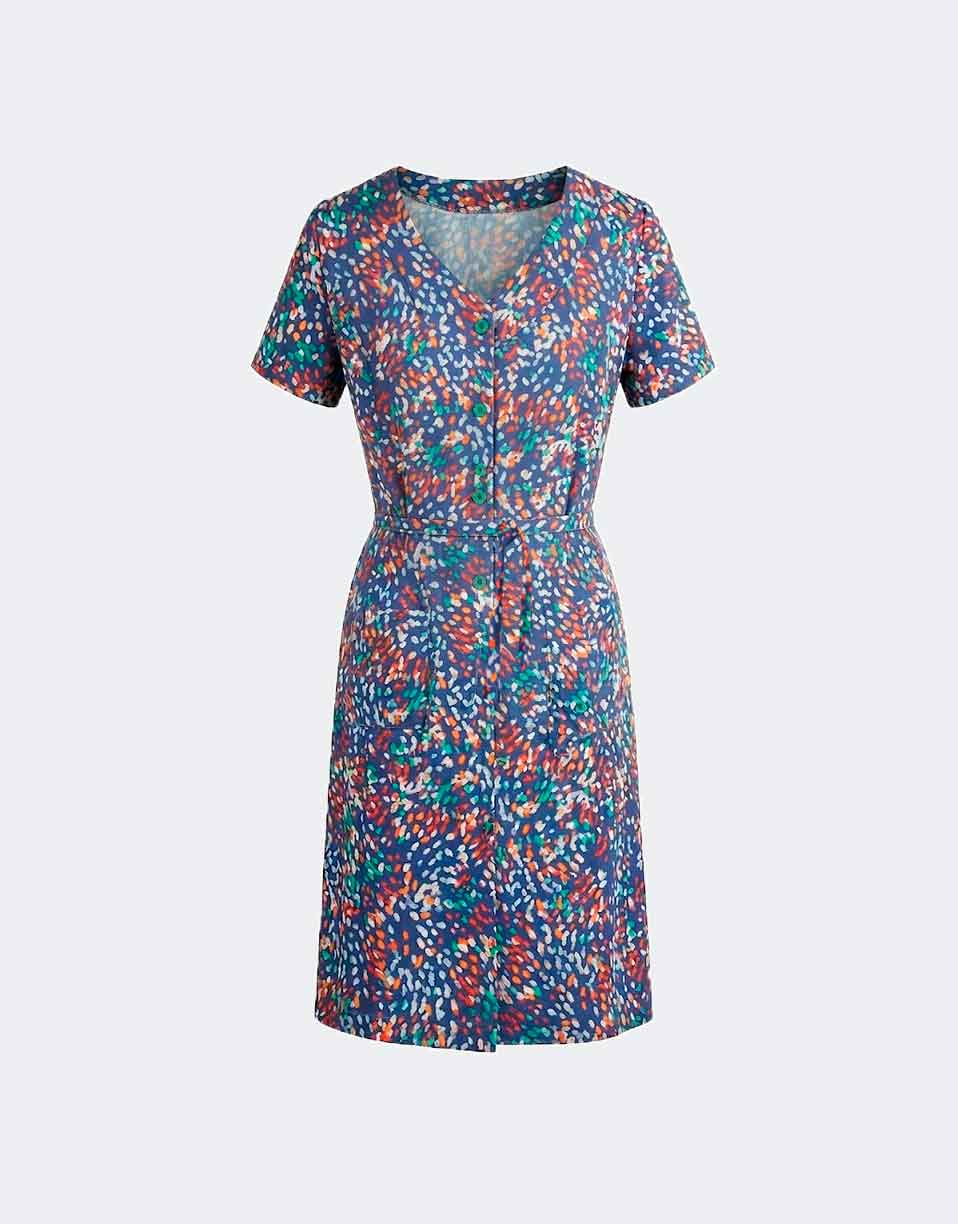 El estampado tipo confeti aporta un toque divertido y colorido. Los pequeños detalles crean un efecto visual dinámico y agradable. Es una opción perfecta para quienes buscan una bata con personalidad.