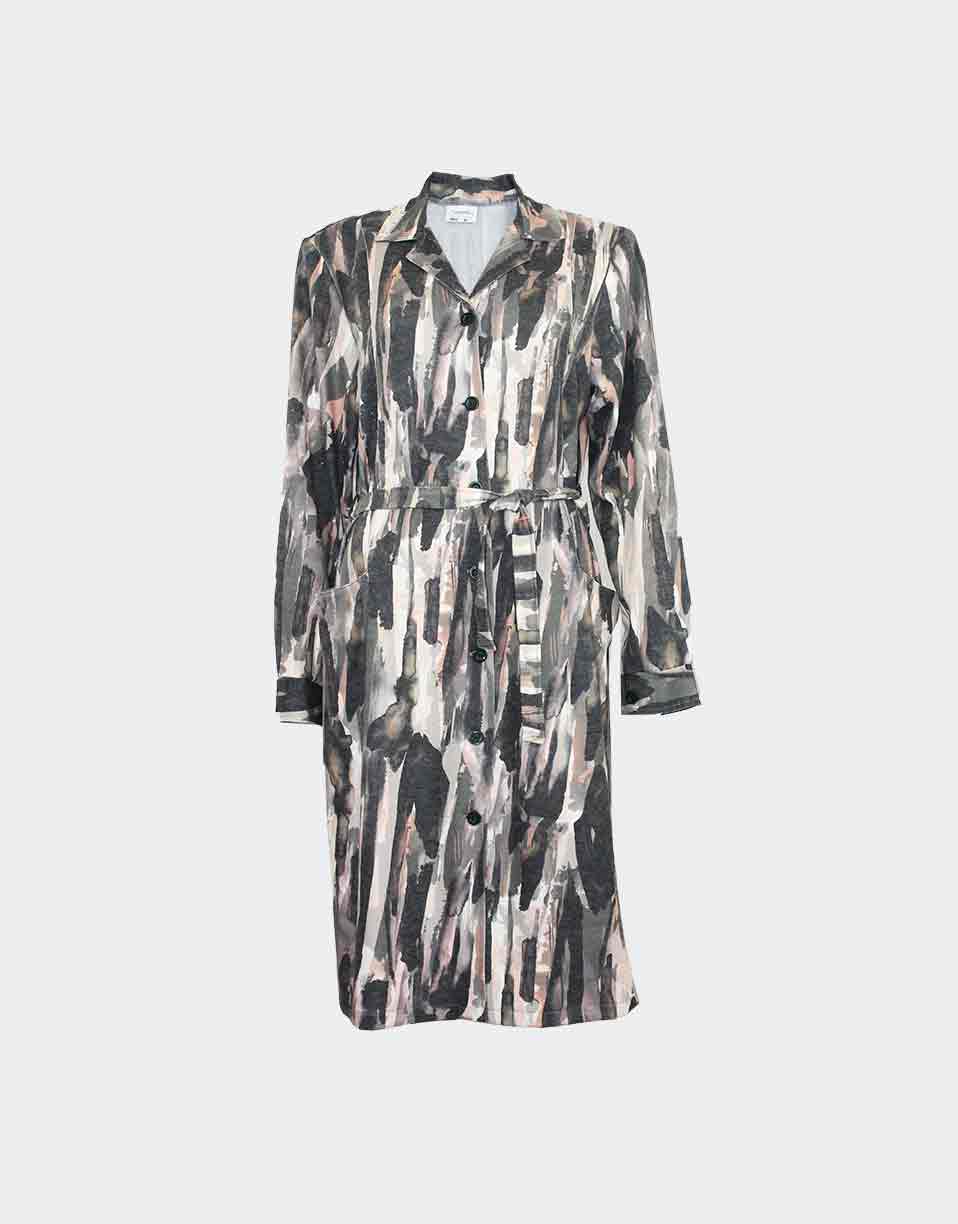 La bata de mujer de punto con cuello solapa, bolsillos y puños con estampado abstracto en tonos tierra