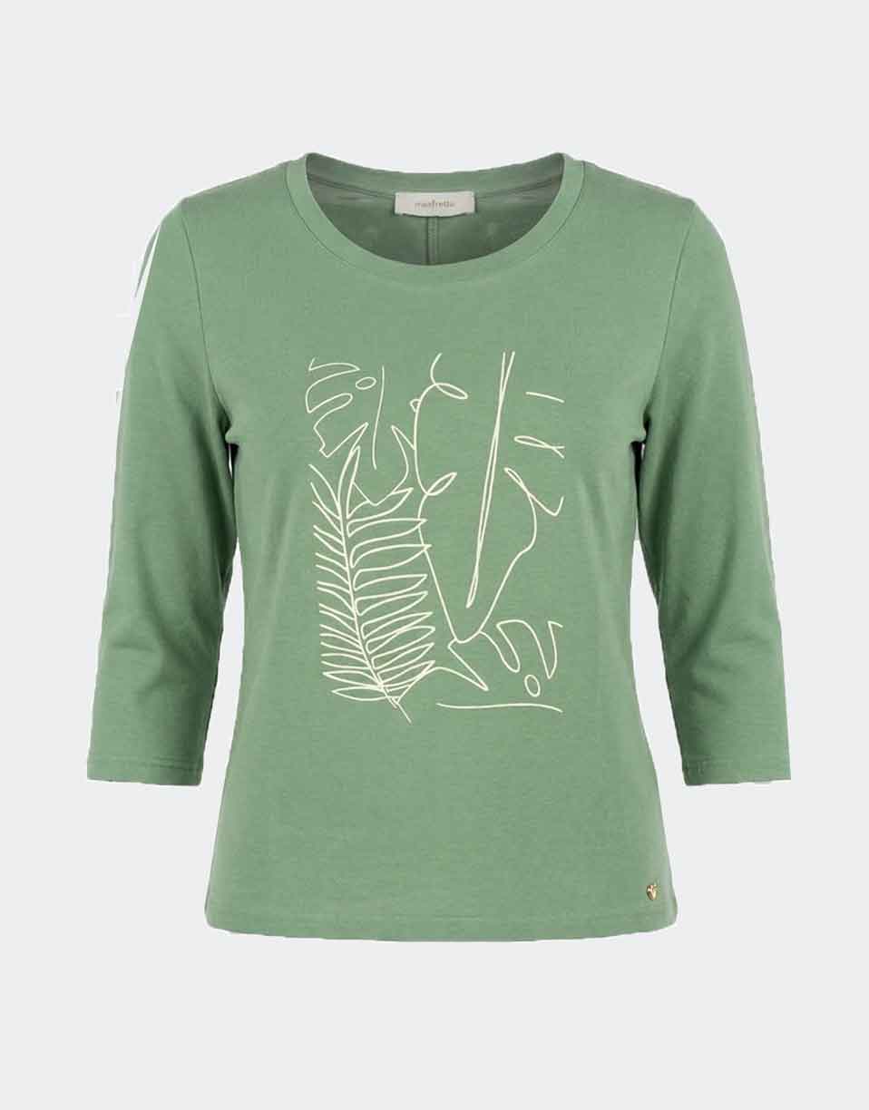 Esta camiseta de mujer en punto con manga 3/4 destaca por su atractivo dibujo con efecto