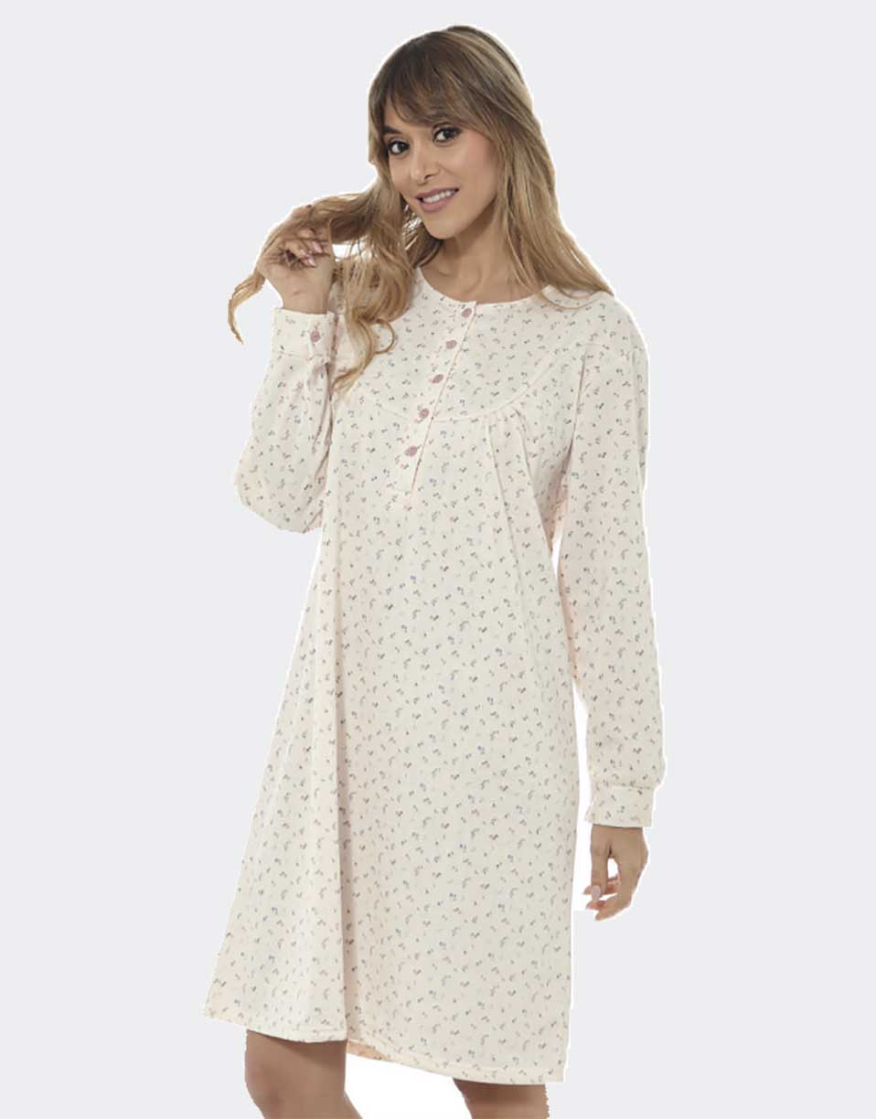 Camisón de Mujer en Punto Felpa con Tapeta de Botones y Canesú Estampado de Florecitas