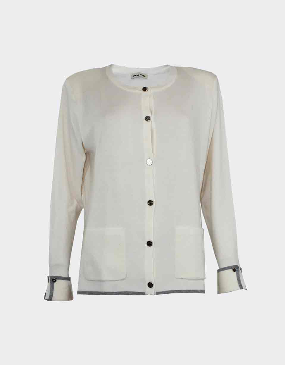 Chaqueta de mujer de punto cuello redondo con botones y bolsillos en color crudo con ribete gris