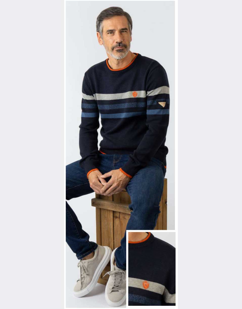 Elige el jersey de hombre de punto algodón PRIVATA azul marino con franjas a contraste y detalles en naranja para combinar estilo, comodidad y versatilidad en tu vestuario diario. Descubre más modelos en nuestra colección de jerséis para hombre.