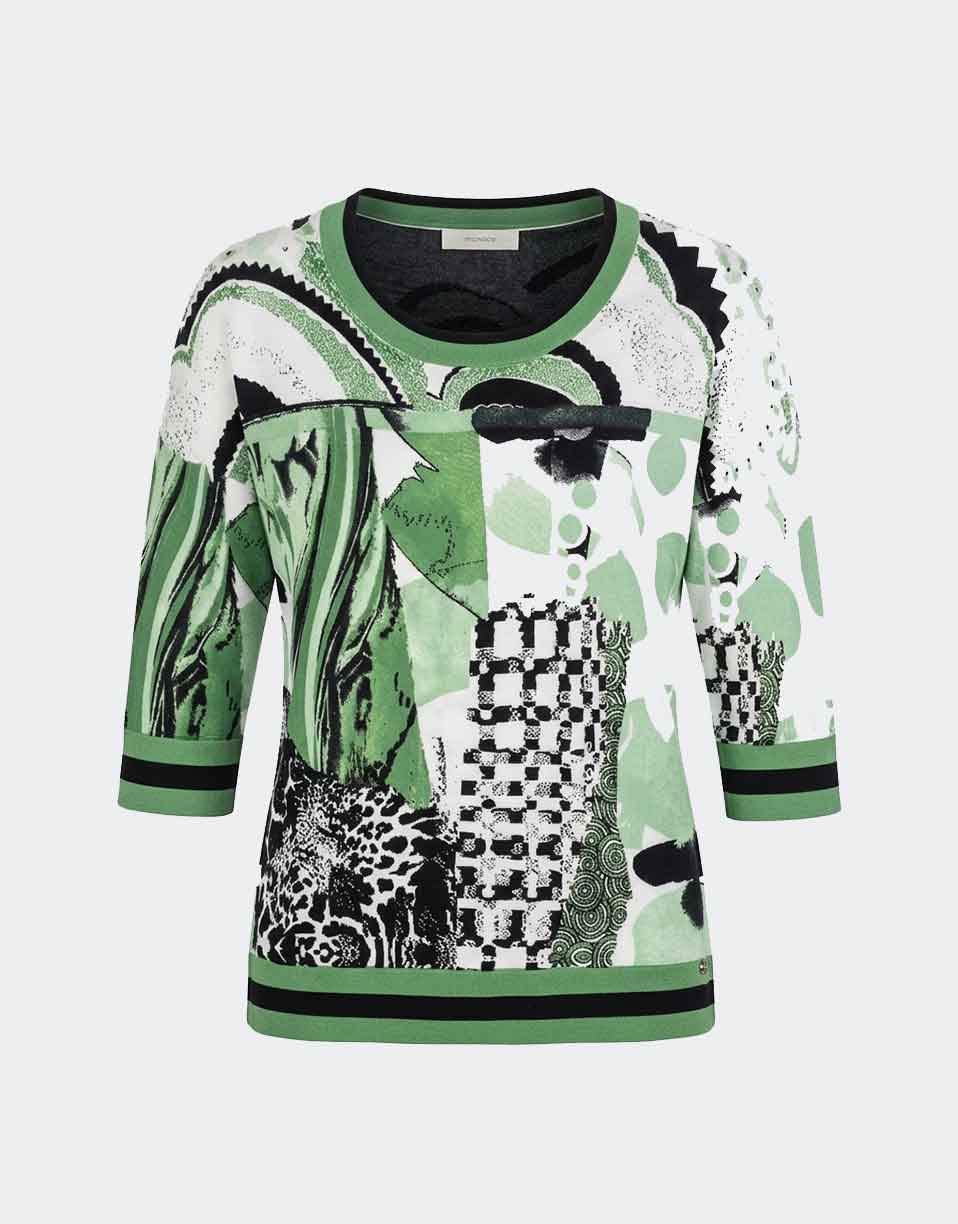 Jersey de Mujer Manga 3/4 en Punto Fino Tricot con Estampado Abstracto en Verde, Blanco y Negro