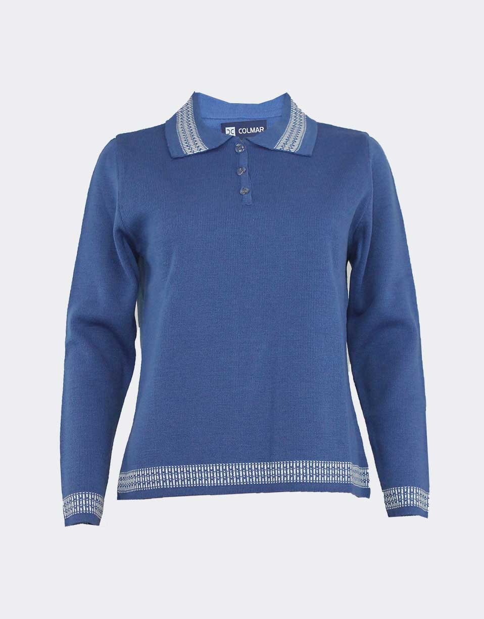 El cuello polo con botones ofrece un estilo atemporal, favorecedor y cómodo. Puede llevarse cerrado para un aire más sobrio o abierto para un look relajado. La cenefa decorativa en cuello, mangas y bajo añade textura y un contraste delicado que resalta la prenda sin sobrecargarla. Gracias a este detalle, el jersey consigue equilibrar lo clásico con un toque contemporáneo.