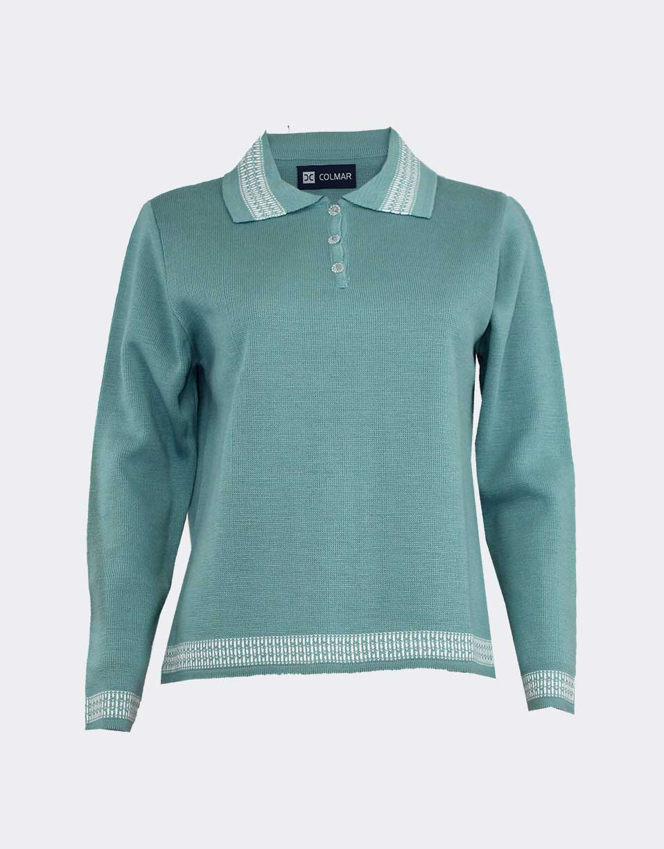 El jersey de mujer en punto con cuello polo y botones es una prenda versátil y elegante que combina la comodidad del punto con un diseño clásico lleno de estilo. Su detalle de cenefa en cuello, mangas y bajo le aporta un acabado original y diferenciado, convirtiéndolo en una pieza perfecta para quienes buscan un toque distintivo en su vestuario diario. Este jersey se adapta fácilmente tanto a looks casuales como a conjuntos más formales, lo que lo convierte en un imprescindible del armario femenino.