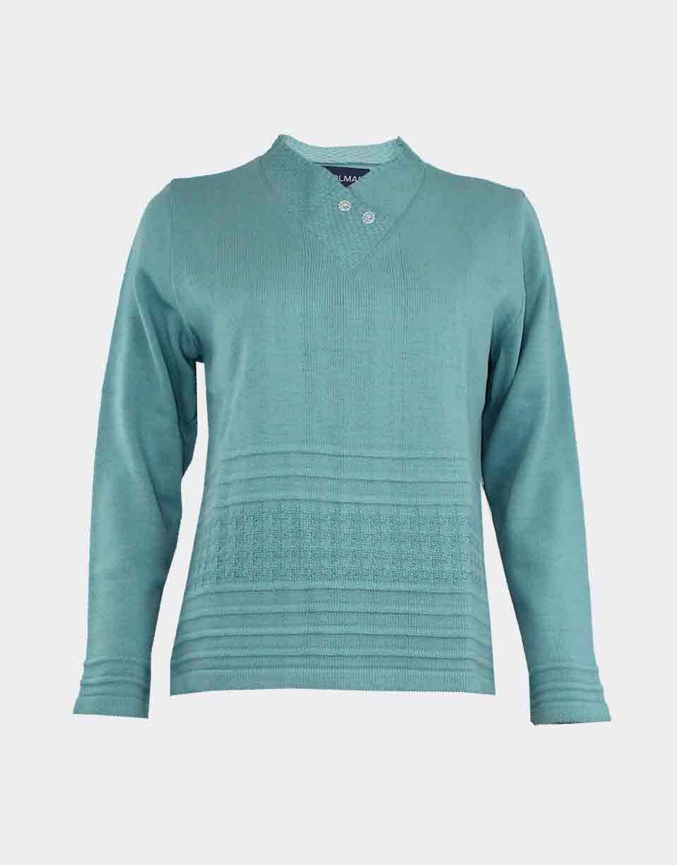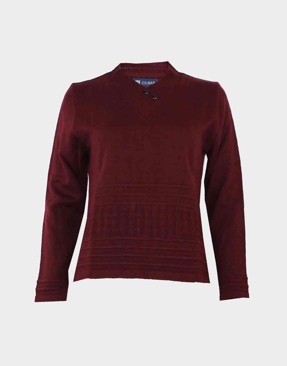 Este jersey destaca por su cuello pico adornado con botones decorativos que aportan un aire sofisticado y actual. El relieve en las zonas clave del diseño da textura y profundidad, creando un acabado visual elegante. Es una prenda que puede usarse tanto en contextos formales como informales, siempre aportando estilo.