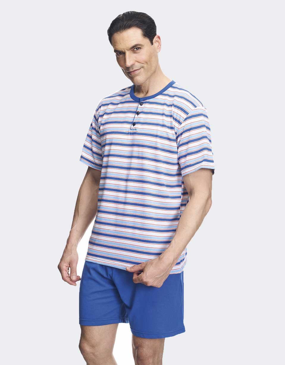 Pijama de hombre corto en punto verano con tapeta de botones y camiseta de rayas azules