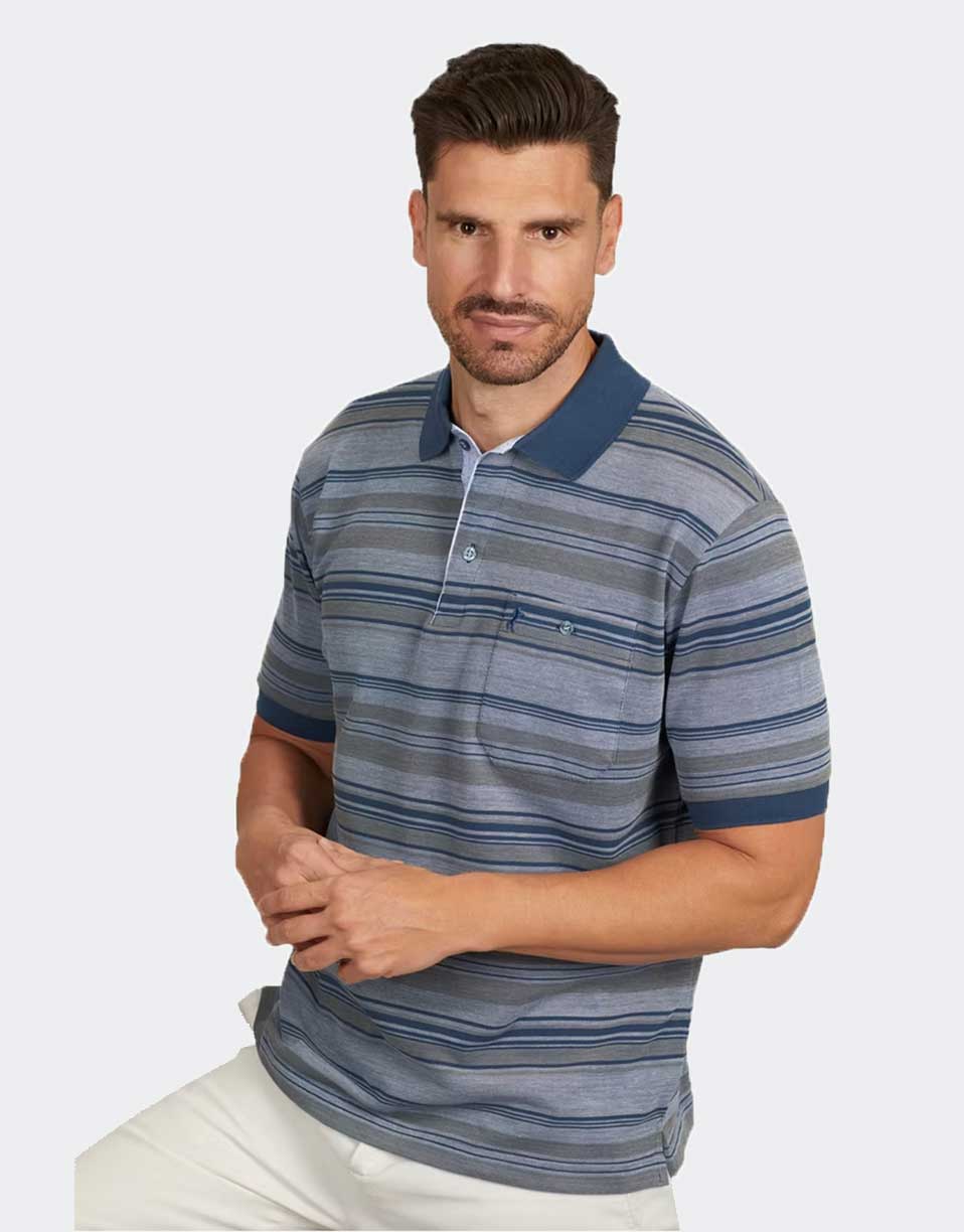 Polo hombre manga corta de punto piqué con bolsillo y rayas pequeñas desiguales en azul y gris